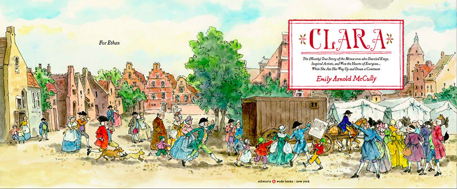 "Nearly three hundred years ago, when half the world was still a mystery to the other half," a rhinoceros named Clara became the toast of Europe, thanks to her impresario, Captain Van der Meer. But this isn't the story of a ruthless entrepreneur and his exploited zoological curiosity. With elegant watercolor and ink drawings and flawless storytelling, McCully (Queen of the Diamond) immerses readers in an era of powdered white wigs ("hairdressers created the style á la rhinocéros") and tricorne hats while capturing a relationship that exemplifies absolute trust and unflagging devotion. Every day, Clara grows by 20 pounds and eats more than 100 pounds of food; moving her requires ever-bigger wagons, and, in one case, a custom-made raft. Yet this interspecies bond only deepens: Van der Meer dotes on his "Clarakin," and on page after page, Clara regards him with openhearted affection-she is his eager collaborator to the very end. McCully calls this a "mostly" true story, and perhaps by strict historical standards, that's correct. But its emotional veracity is never in question. Ages 4Ð8