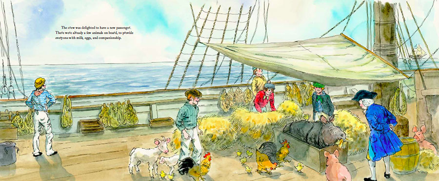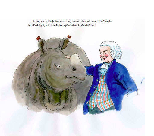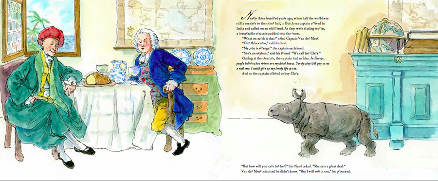 In 1741, Captain Van der Meer sailed to India and returned to Holland with a "mythical beast," an orphaned one-year-old rhinoceros named Clara. Van der Meer grew to love his new friend, who rewarded his kindness with affection and trust. He took her throughout Europe, where crowds and even royal heads of state came to see her. As she grew, the problem of raising money to feed her became more challenging, but Van der Meer persisted, and they traveled together for 17 years, until Clara's death. In this smoothly written, fictionalized tale based on historical facts, McCully shows what a marvel it was at that time before nature films, photography, and zoos for people to see a large, unfamiliar animal, though in an appended note, she mentions that today "we know that confining and exhibiting a wild animal is inhumane." Graceful, expressive, and beautifully composed, the ink-and-watercolor illustrations portray the young rhino as small, easygoing, and adorable, and the older Clara as large, gentle, and still adorable. Pair this handsome volume with the many history-based picture books, such as Dianne Hofmeyr's Zeraffa Giraffa (2014), telling of a giraffe that traveled from Egypt to France in 1826 and, like Clara, drew admiring crowds wherever she went. - Carolyn Phelan